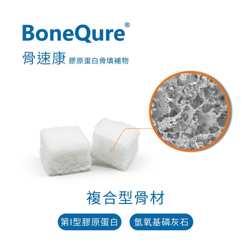 “安鎂佳”骨速康膠原蛋白骨填補物主要由骨填料與調和劑所組成,其中骨填料為可吸收之膠原蛋白與氫氧基磷灰石混合而成,膠原蛋白成分為萃取自豬皮之第 I 型膠原蛋白 (Type-1 Collagen)。